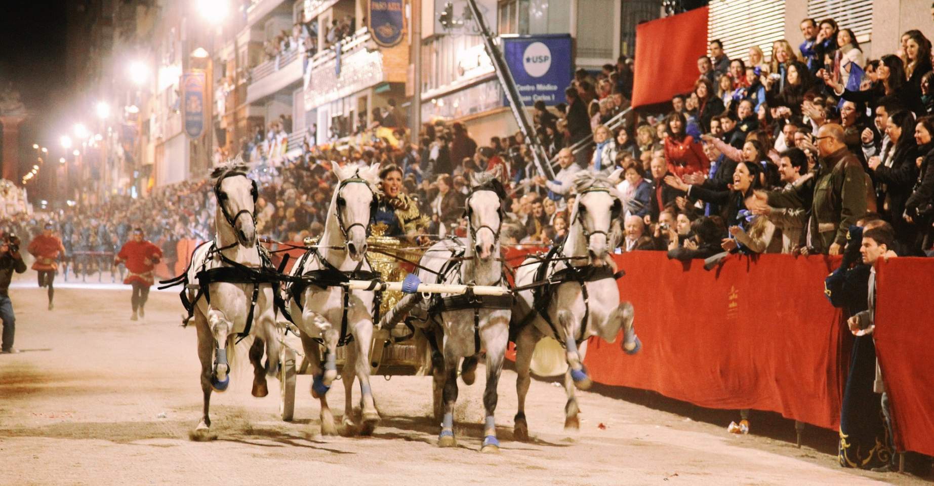 Los caballos son uno de los elementos más característicos de estas procesiones. Monturas ricamente enjaezadas avanzan con elegancia junto a cuadrigas, carros triunfales y jinetes que representan desde emperadores romanos hasta reyes bíblicos. Los animales, cuidadosamente entrenados, ejecutan pasos coreografiados que convierten el desfile en una combinación de procesión, representación histórica y espectáculo ecuestre.